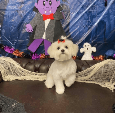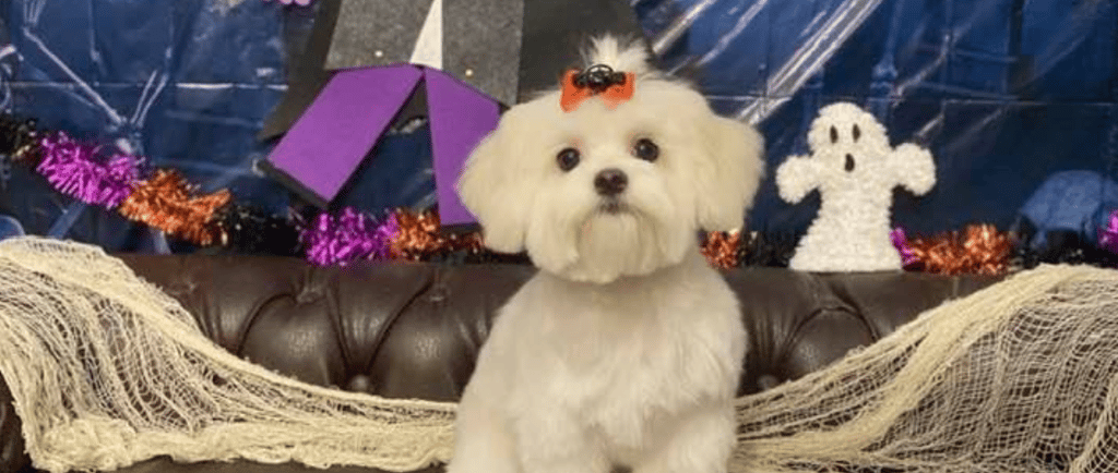 Poppy at Halloween. This was a photo of Poppy at 1 year old on her first Halloween. She was at the groomer and was just beautified. They put her on the sofa and like a pro she modeled for them. You can't see it in this picture, but she even lifted her one paw up!